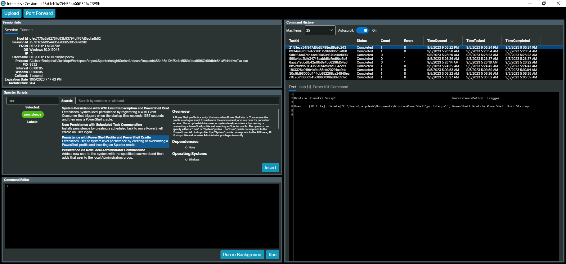 WARNING: This persistence method may generate a large number of callbacks if there are a lot of PowerShell processes executing on the target system. You may want to consider building a custom Specter with a startup script that checks for duplicate sessions and exits if one is found.